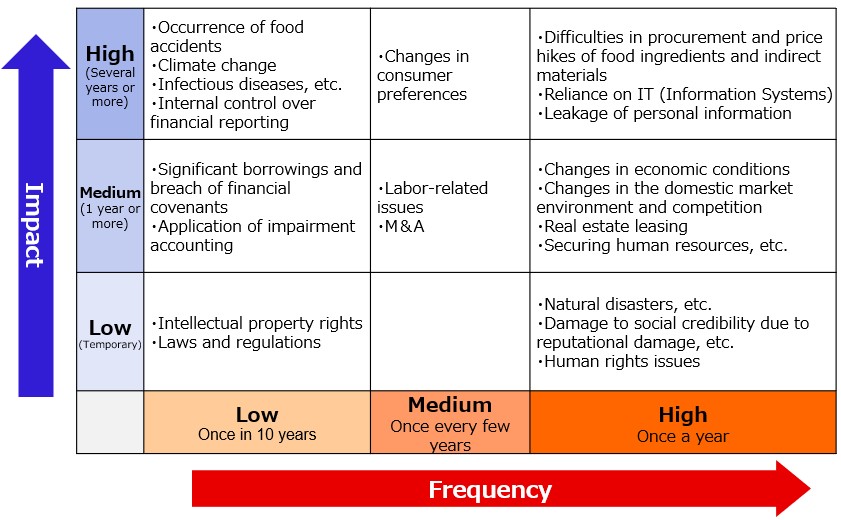 With the increasing trend on a global scale to rationalize energy use and to curb climate change such as laws and regulations to combat global warming, we recognize that climate change is one of the key risks affecting the sustainability of our Group's business. Transition risks related to climate change (e.g., the risk that procurement and energy costs will increase due to the introduction of carbon taxes, higher electricity prices, and other environmental regulations to combat global warming; the risk that the Group's brand image and social credibility will be damaged because the Company is perceived as not environmentally conscious) and physical risks (i.e., acute risks such as plant and logistics outages and store closures due to typhoons, floods, and storm surges, and chronic risks such as a decline in food quality and price hikes due to increases in average temperatures and changes in weather patterns) may affect the Group's business performance.