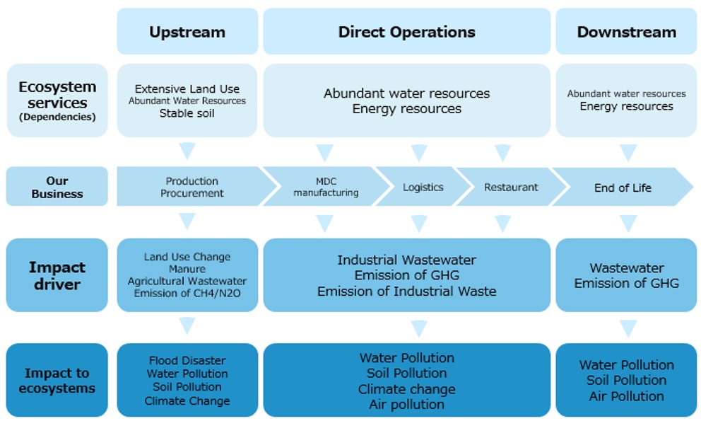 Using "ENCORE," we confirmed the materiality of our business activities (upstream and direct operations) in terms of dependence and impact on natural capital, and identified business activities with particularly high materiality.