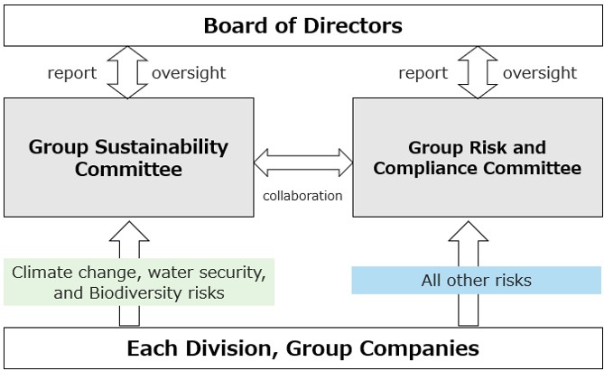 Under the supervision of the Board of Directors, we have established a governance structure to promote sustainability management across the Group, including the "Group Sustainability Committee" as the decision-making body for initiatives related to natural capital such as climate change, conservation of water resources, and biodiversity.
