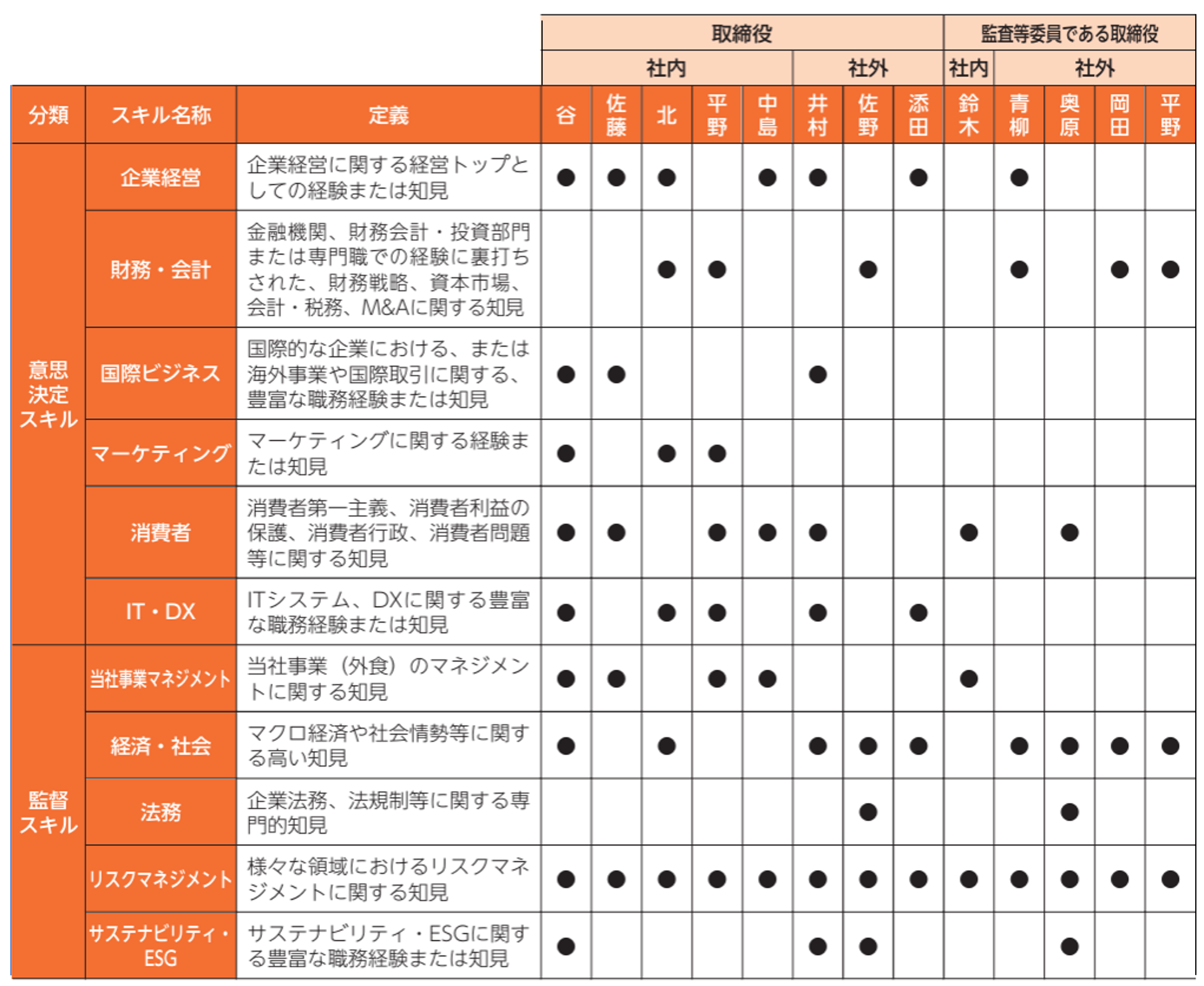 変化の激しい外食市場に対応するため、社内外を問わず、多様な知識・経験・能力を持つ取締役候補者を指名しています。